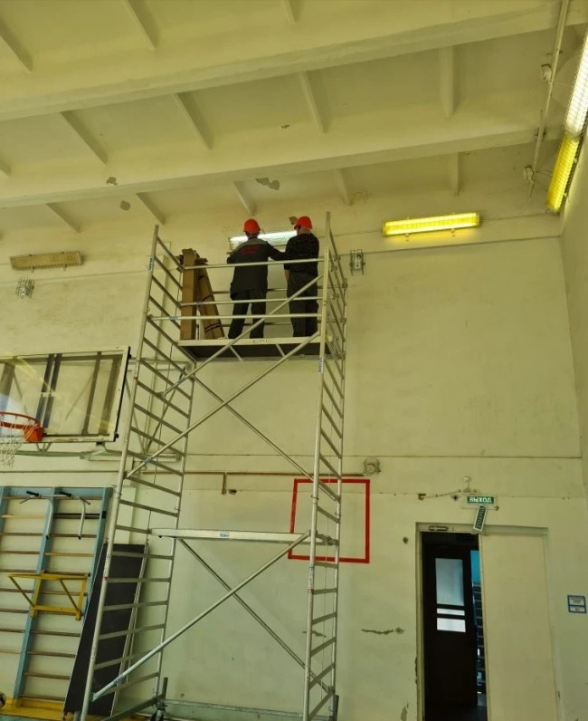 В спортзале школы № 12 на высоте 9 метров заменили лампы с помощью туры.