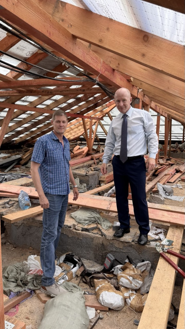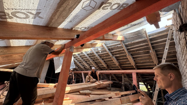 Директор МАУ "Коммунальное управление" Сергей Волотовский совместно с представителем МКУ "Городское строительство" Денисом Шумилиным проверили ход работ по капитальному ремонту крыши административного здания по адресу: пл. Преображения, 1.