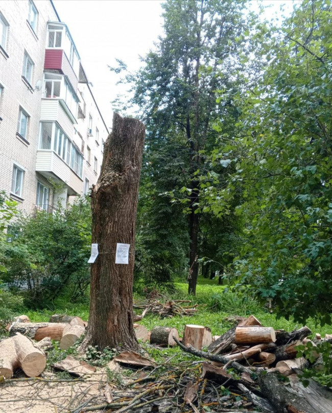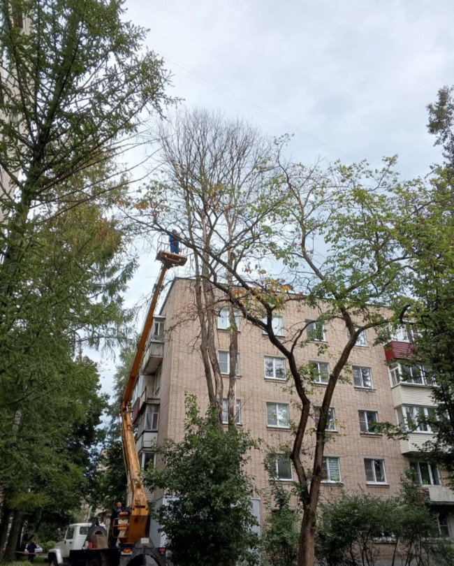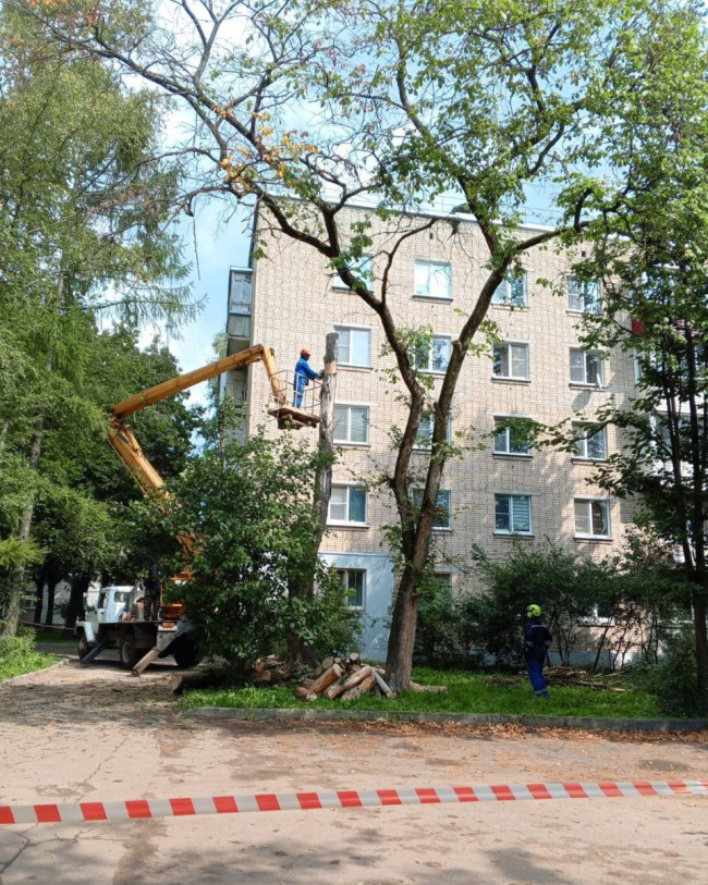 По результатам рассмотрения обращения жителей дома 122 по пр. Ленина и проведённого обследования специалистами экологического отдела Администрации г. Обнинска, работниками МАУ "Коммунальное управление" были осуществлены работы по спилу аварийных деревьев